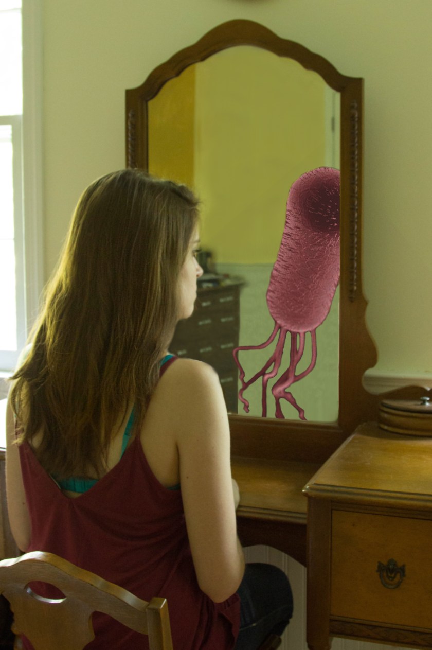 Bacteria have receptors for our hormones and neurotransmitters. This means that what is going on in our bodies can influence their growth and possibly behavior. For instance, the neurotransmitter norepinephrine, which is released when we are stressed, can make certain pathogenic bacteria grow faster and be more virulent (cite Mark).